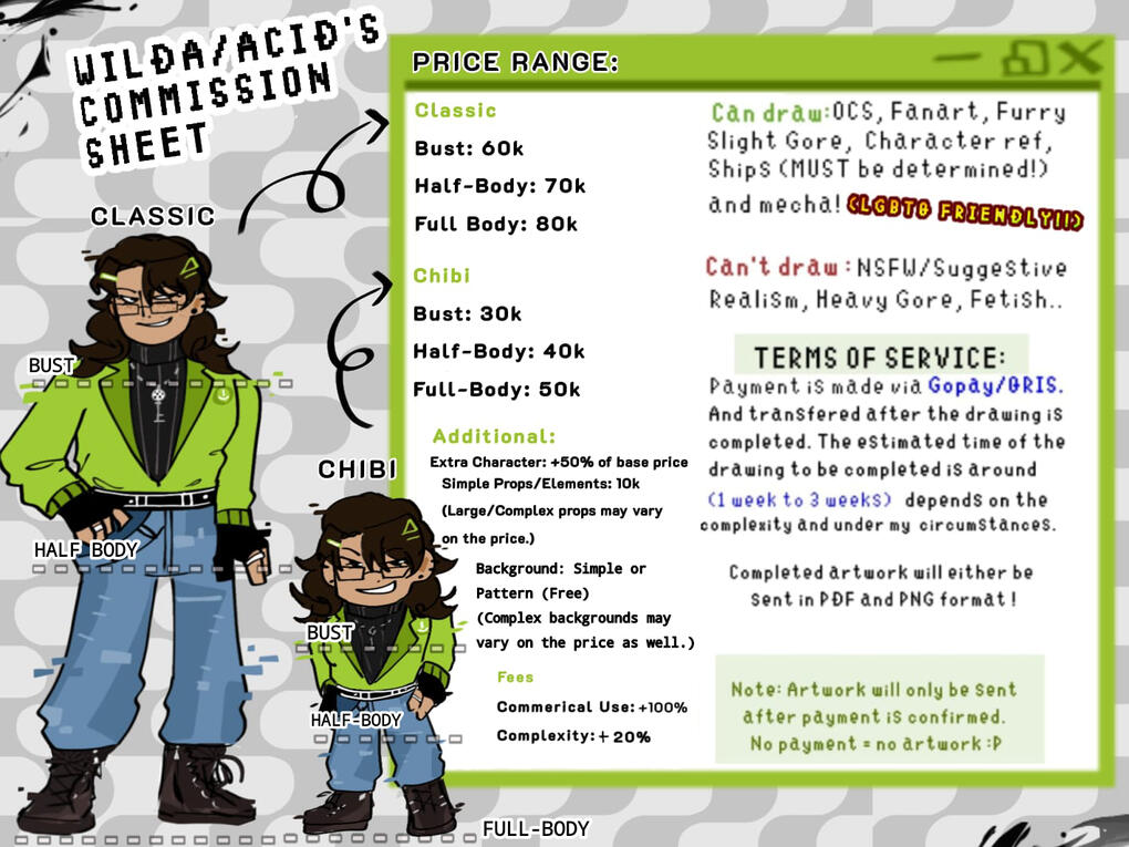 > Note: Artwork will only be sent after payment is confirmed. No payment = no artwork:pCan only do IDR Commissions!